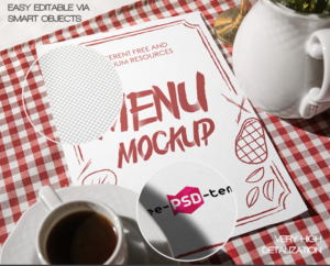 This menu card mockup features a sober menu card placed on a table beside a cup filled with tea. It has a photorealistic appearance. Also, it is fully editable via smart objects. It is available in a layered photoshop compatible PSD format. It includes a PSD file. After downloading the mockup, open the PSD file in Photoshop and make all the customizations. Furthermore, the best thing about the mockup is you can have it for free.