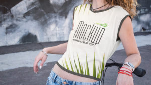 This magnificent PSD-mockup depicts a girl with a bicycle in front of a wall in a short T-shirt or you can say a crop top. It helps you embody your creative ideas and save your precious time. All you need is to add a design to the top with a few simple steps. It is available in print ready format. So just download the mockup for free and customize the PSD file in Adobe Photoshop using its smart objects. It is easily editable.
