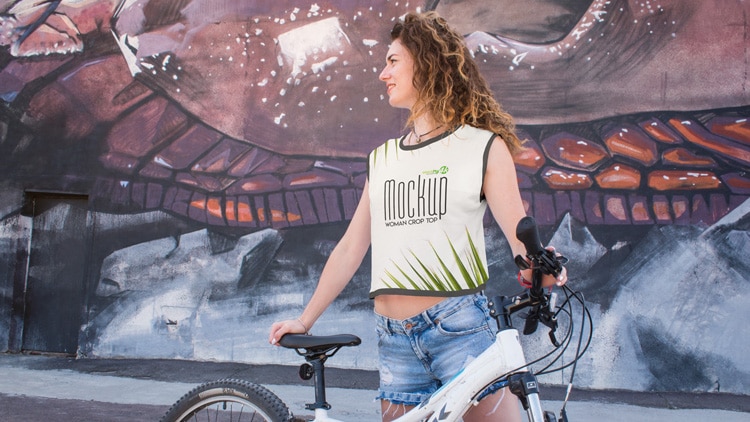 This magnificent PSD-mockup depicts a girl with a bicycle in front of a wall in a short T-shirt or you can say a crop top. It helps you embody your creative ideas and save your precious time. All you need is to add a design to the top with a few simple steps. It is available in print ready format. So just download the mockup for free and customize the PSD file in Adobe Photoshop using its smart objects. It is easily editable.