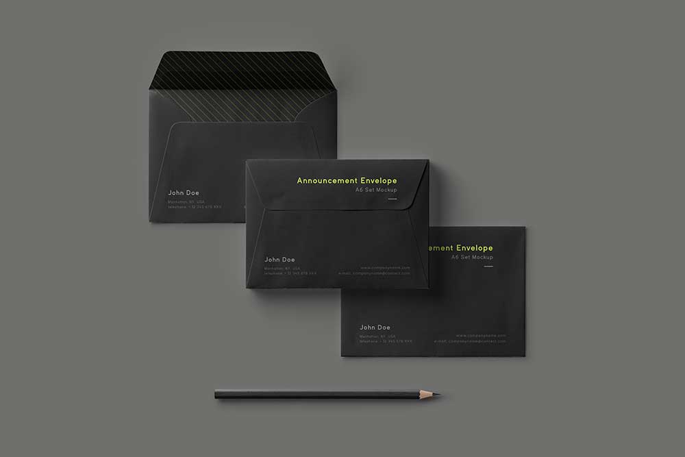To utilize this freebie, download the file and open it in Photoshop. Then, upload your own artwork via smart object layer. Specifically, this mockup exhibits three envelopes- a front design, a back, and an open envelope. Furthermore, the pen, the envelopes and also the background are customizable to match with your designs.