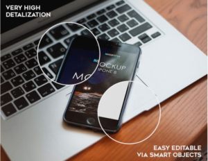 The iPhone 8 mockup displays two images – one picture shows a phone held in hand and another picture shows a phone is placed on an open laptop and a wooden table. The design of this mockup helps you create a photorealistic presentation for your creative work. The mockup includes easy to use, print ready and fully layered PSD file, having high detalization and superb dimension.