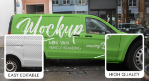 It is a top quality, layered and easily editable mockup that you can use without paying any cost. This mini van vehicle branding mockup is the perfect choice for branding cargo vans or courier vehicles. At the same time, with its smart objects, you can make a realistic presentation of the car from different angles. You can insert extraordinary ideas to make this artwork in 4K resolution.