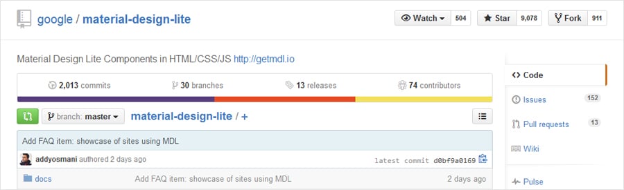 Currently, Bootstrap has 33,604 forks, 658 contributors, 83,232 avid followers on GitHub and MDL started with 911 forks, 74 contributors and 9,078 avid followers on GitHub.