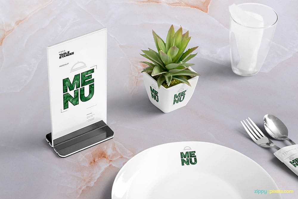 Basically, you can see in this mockup, a table standee, plant pot, plate, glass, and napkin. Each of this item is placed in separate folders so you can easily customize all of them. Specifically, you can integrate a design for the table menu, plate, plant pot and napkin using smart objects. This PSD mockup also offers a beautiful marble textured background in two different shades but you can also use your own background.